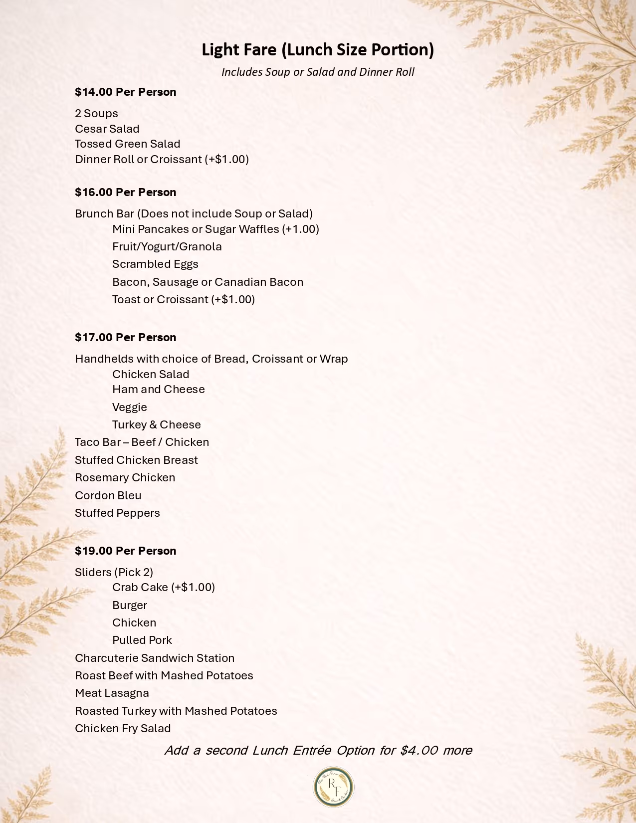 Make your event unforgettable with The Red Fern’s full-service catering. From elegant plated dinners to casual buffets, our expert chef crafts menus to suit any style, dietary need, and budget. Whether at our venue or your location, we bring fresh flavors and seamless service to every gathering.